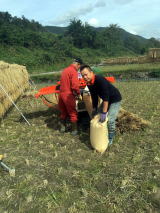 脱穀 | 天日干しのお米をハーベスターを使って収穫作業。 牛の片付け |