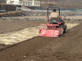 トラクターで苗床づくり。 苗床用地に米糠投入・耕運 |
